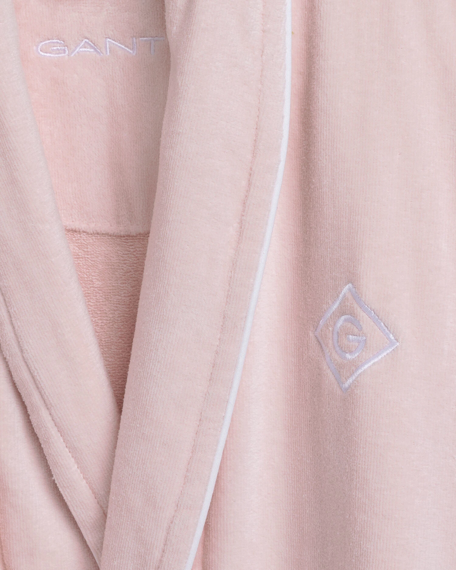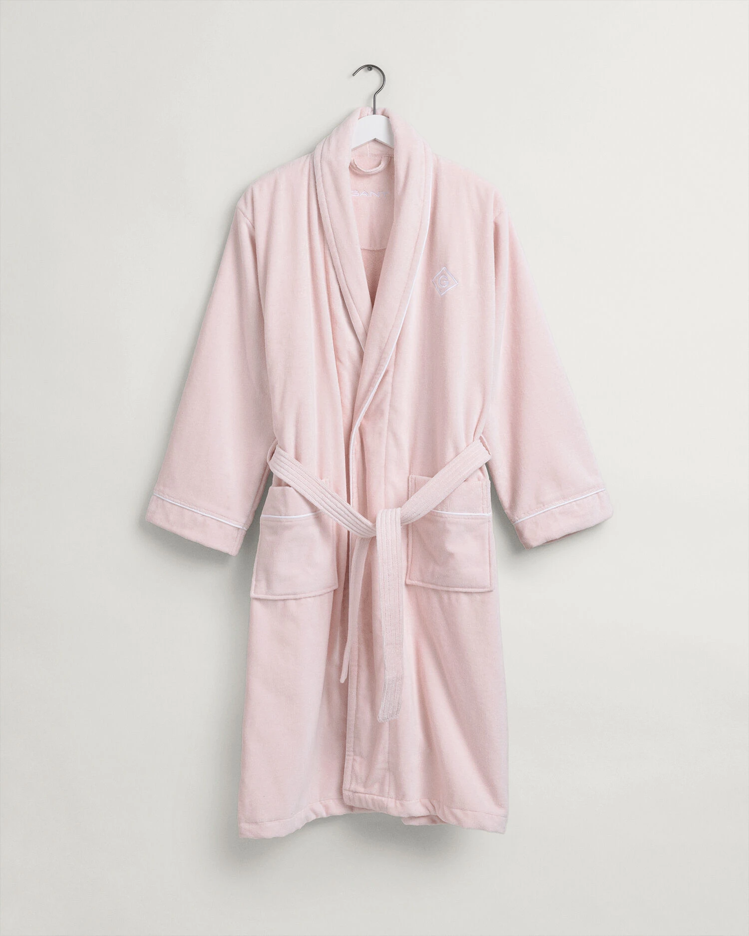 Vår Iconic G-kolleksjon gir hjemmet følelsen av et luksushotell. Den kombinerer materialer av høyeste kvalitet med en sofistikert design som hever hjemmet ditt. Denne badekåpen er en unisex badekåpe i tykk velurfrotté for en luksuriøs loungewear-look. Den har dekorative piping-detaljer og vår Diamond G-logo brodert på brystet.